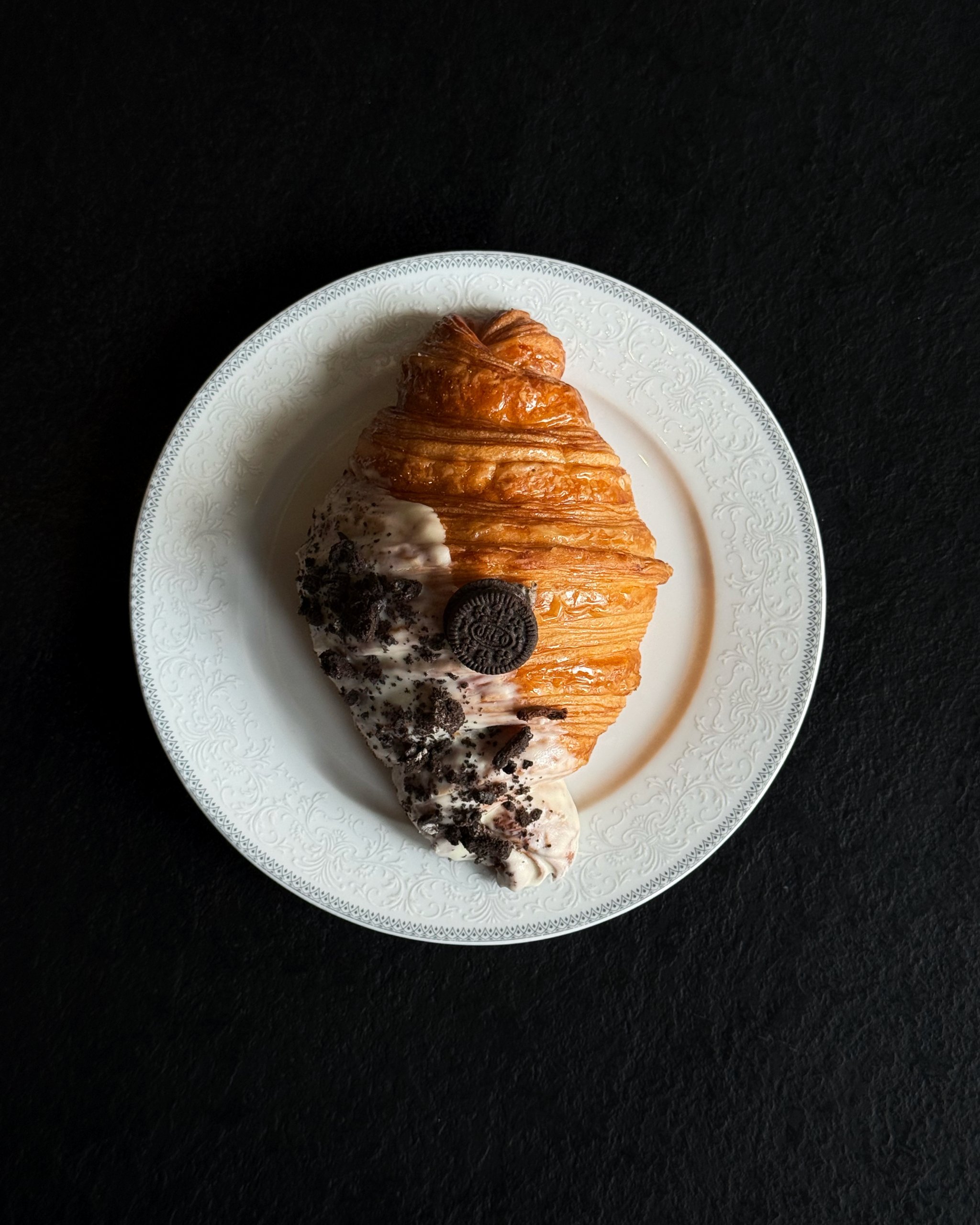 Хрусткий круасан із ніжним пломбіром з печивом: молоко, вершки, крихта печива та чорний шоколад